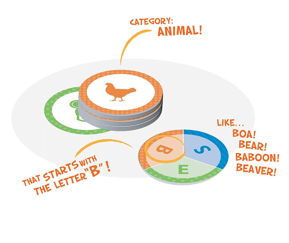 2. The first player to call out loud a word starting with the letter matching the color of the category wins the card。第一个准确大声说出与类别颜色相匹配的字母开头的单词的玩家将赢得卡片。与动物类别相同颜色橙色的英文开头字母~B,开头的单词,动物单词抢答,看谁最快说:Bear 熊!boa 蟒蛇!baboon 狒狒!beaver 海狸!……