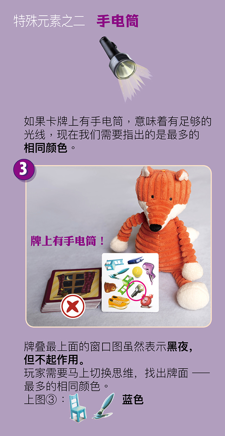 参加者根据下一张牌显示昼夜条件,清楚的说出牌上最多的颜色或者物品名称,卡牌上还有不少的“陷阱”,窗帘, 手电筒,地球仪能触发新的规则,参加者除了眼明手快,还要细心分辨,以免出错。